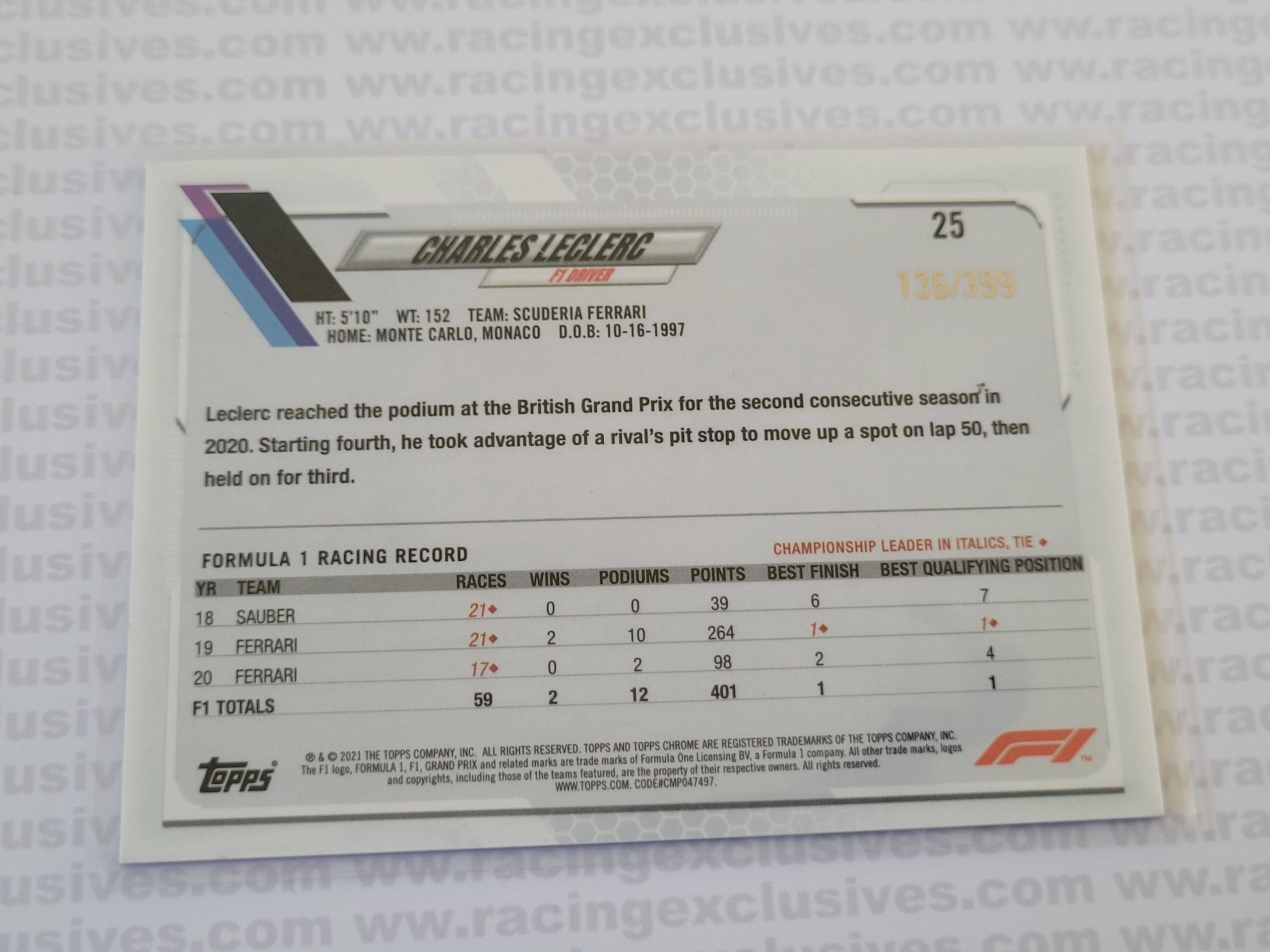 Charles Leclerc – 2021 Topps F1 Chrome – #25 136/399 Purple